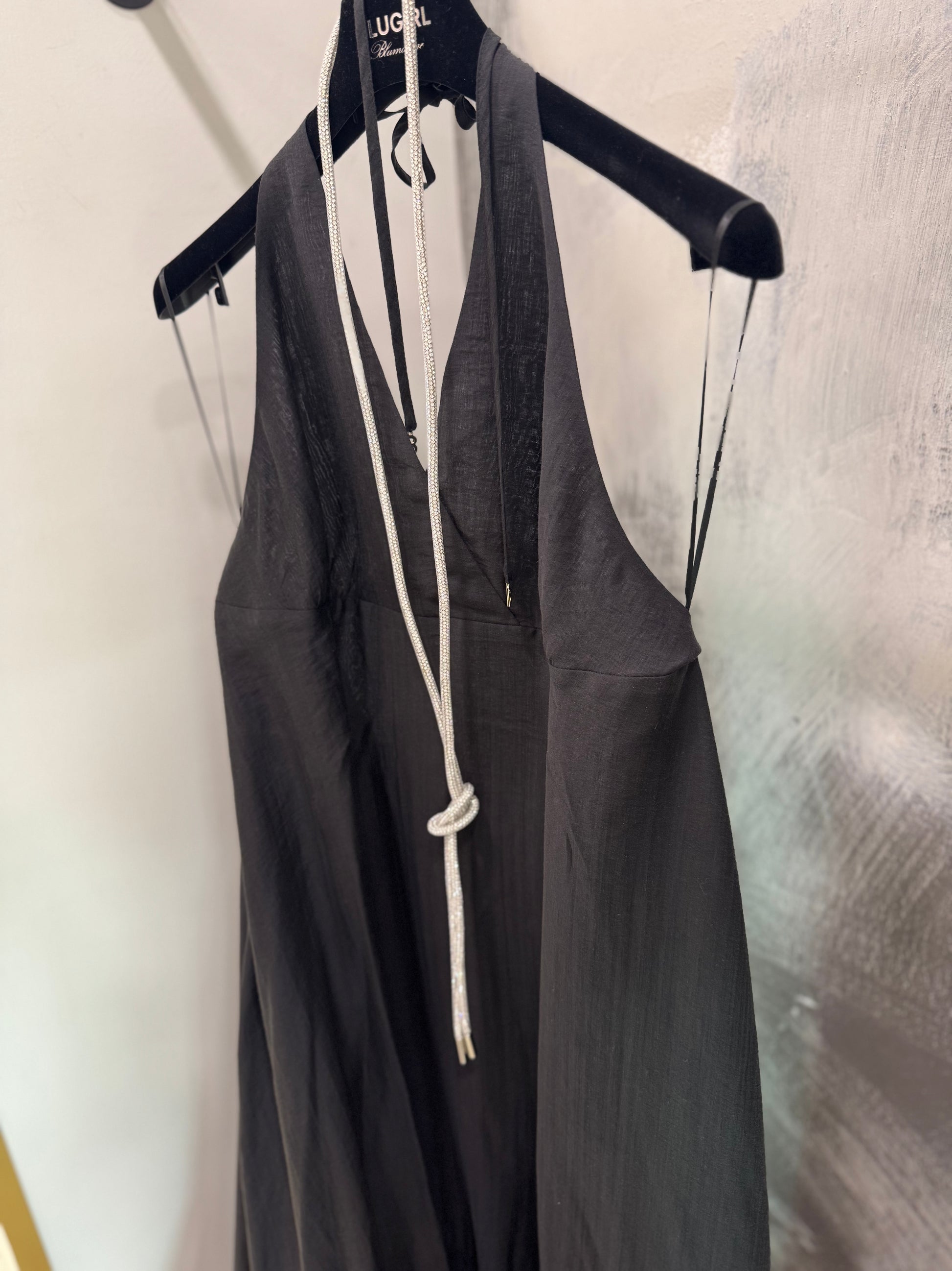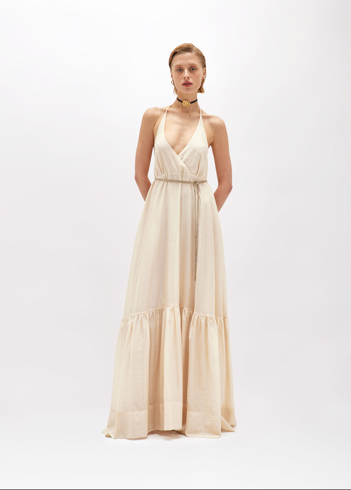 Fresco e femminile l'abito lungo Blugirl realizzato in tencel leggero con cintura in tubolare di strass rivestita di tulle. Presenta scollo profondo con incrocio davanti, spalline sottili, balza arricciata al fondo, scollatura profonda sul retro e linea morbida. Perfetto per le sere d'estate. La modella è alta 1.72 e indossa la taglia 40.