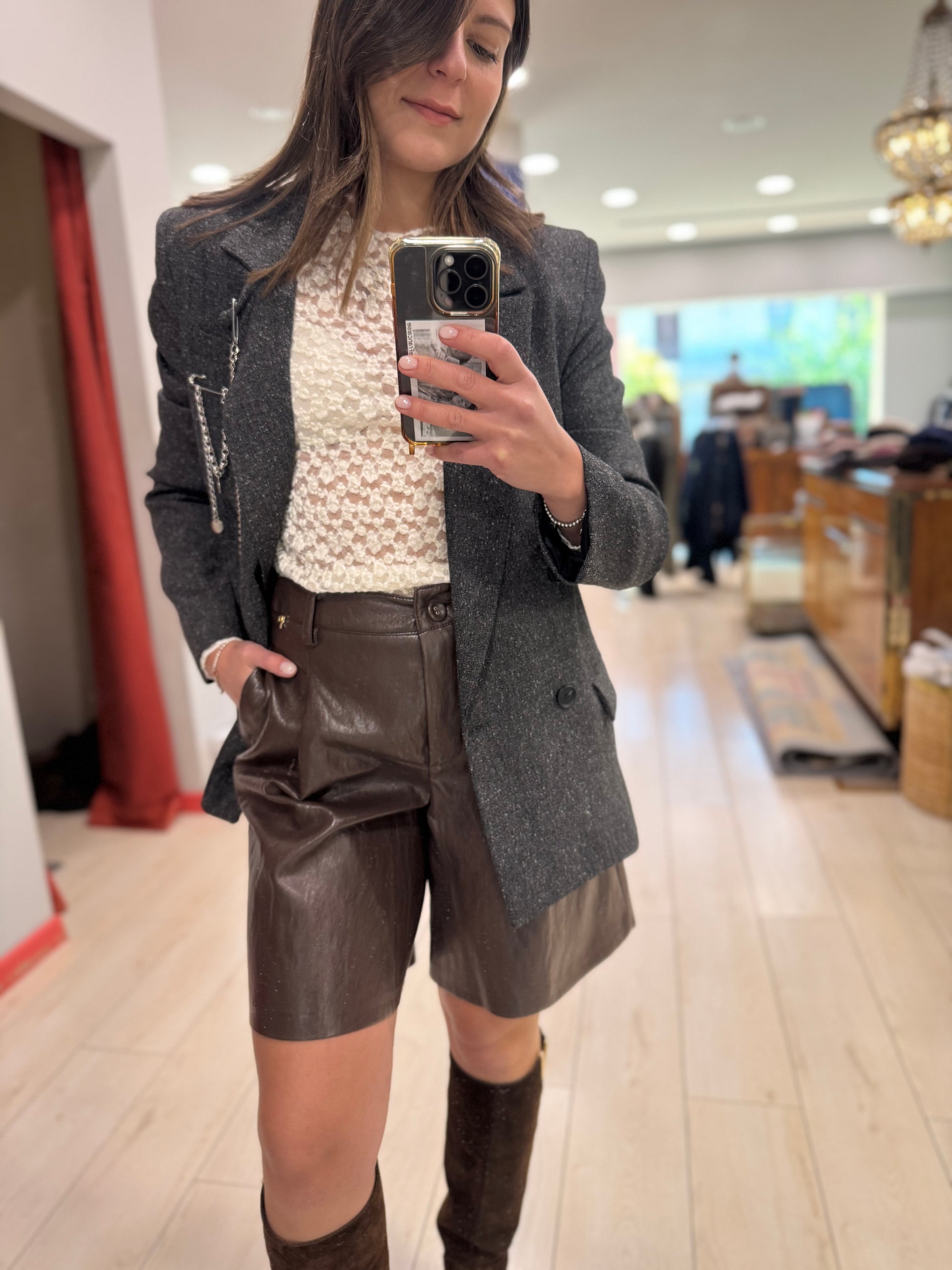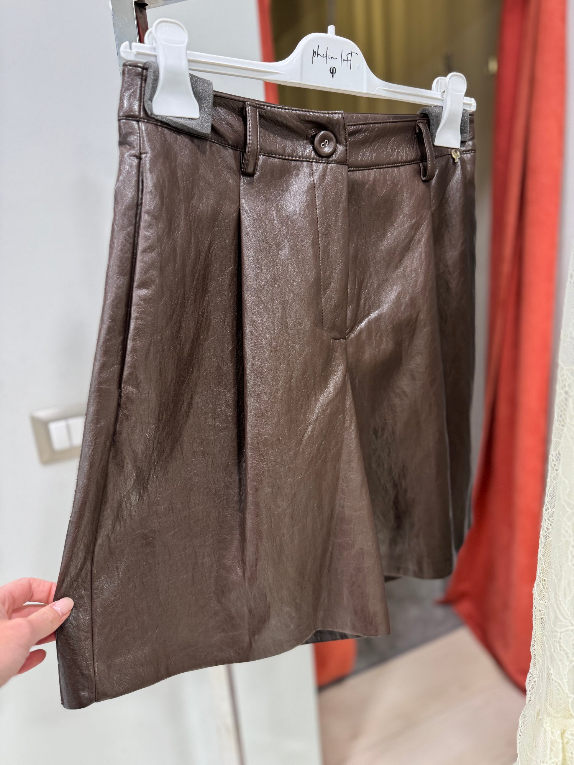 Bermuda in ecopelle morbida con linea pulita e moderna. Vita regolare, gamba dritta sopra al ginocchio e pinces frontali per una caduta elegante. Chiusura con bottone e zip e passanti per la cintura: facile da abbinare con camicie, maglie e blazer per uno stile sporty-chic di stagione. Colore: marrone (unica variante). Taglie: XS–L.
