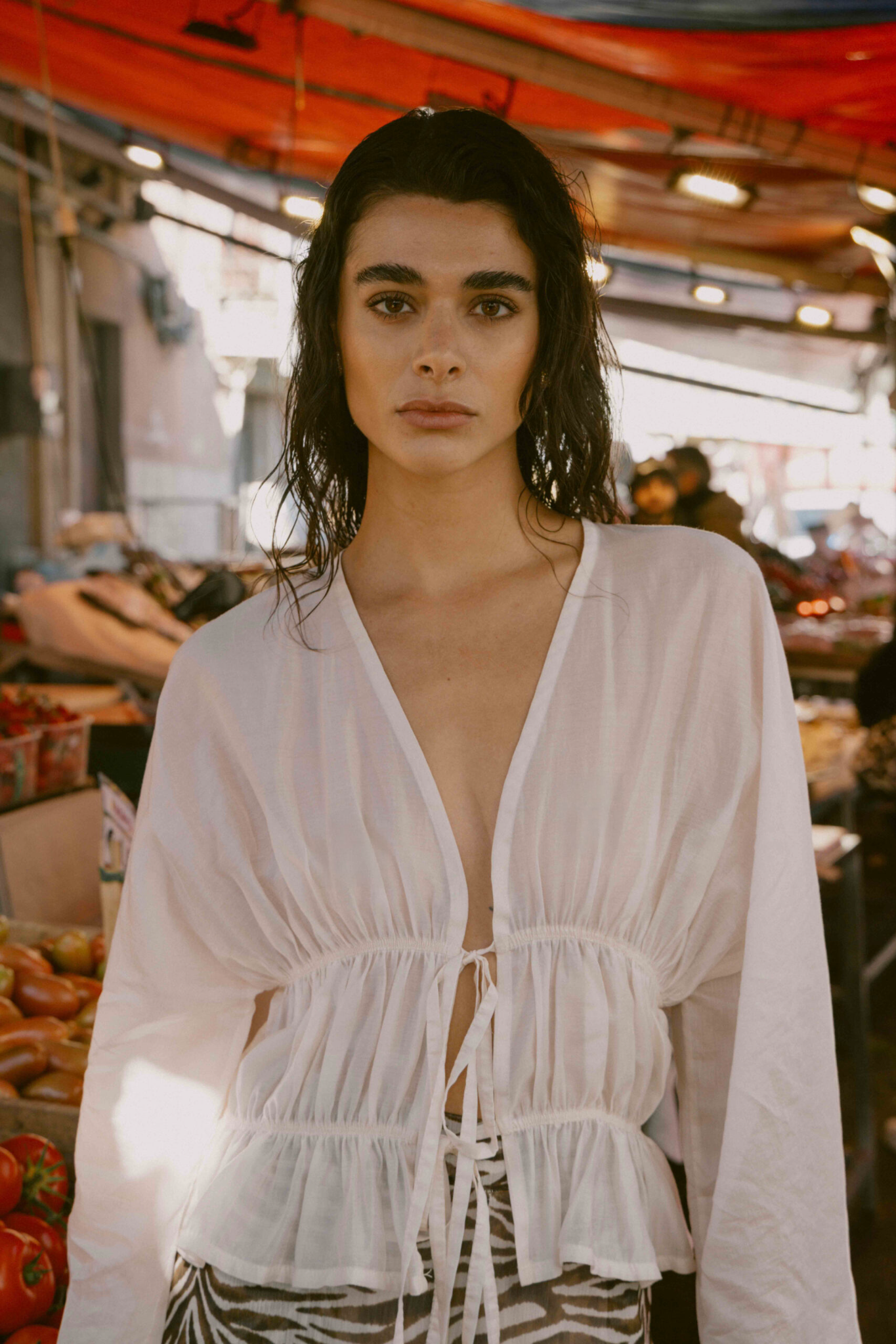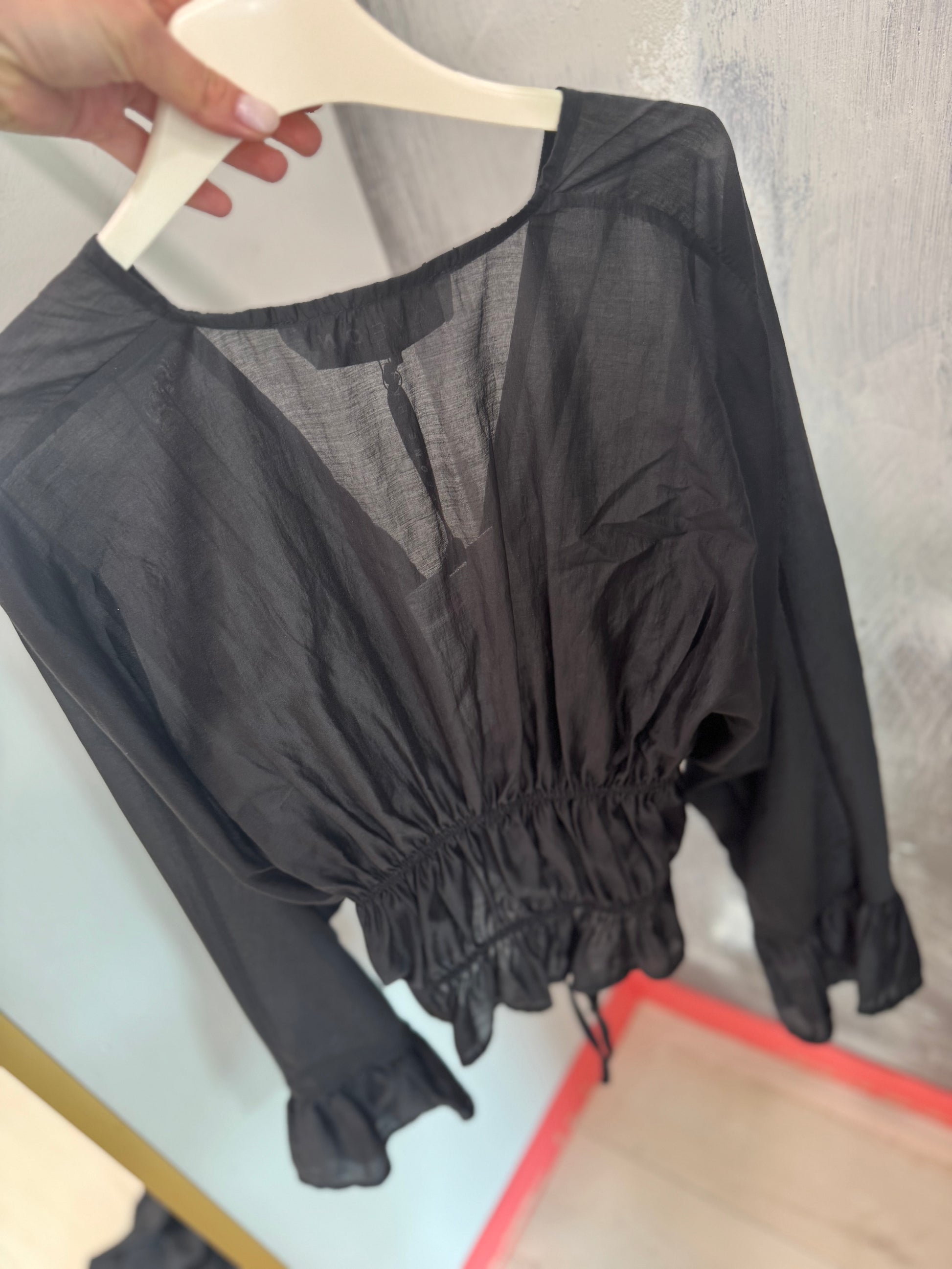 Blusa nera con lacci sul davanti regolabili.
