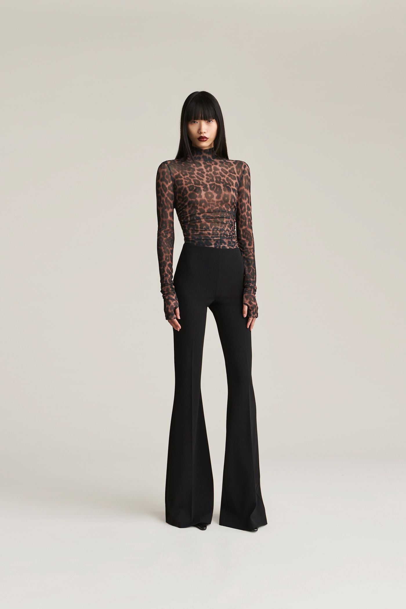 Il body Judy è una dichiarazione di femminilità wild. La stampa animalier all over cattura lo sguardo, mentre il drappeggio sul busto disegna volumi mirati e sofisticati. Il collo alto aggiunge un tocco grafico e deciso, bilanciato dalla morbidezza del tessuto stretch che aderisce come una seconda pelle.