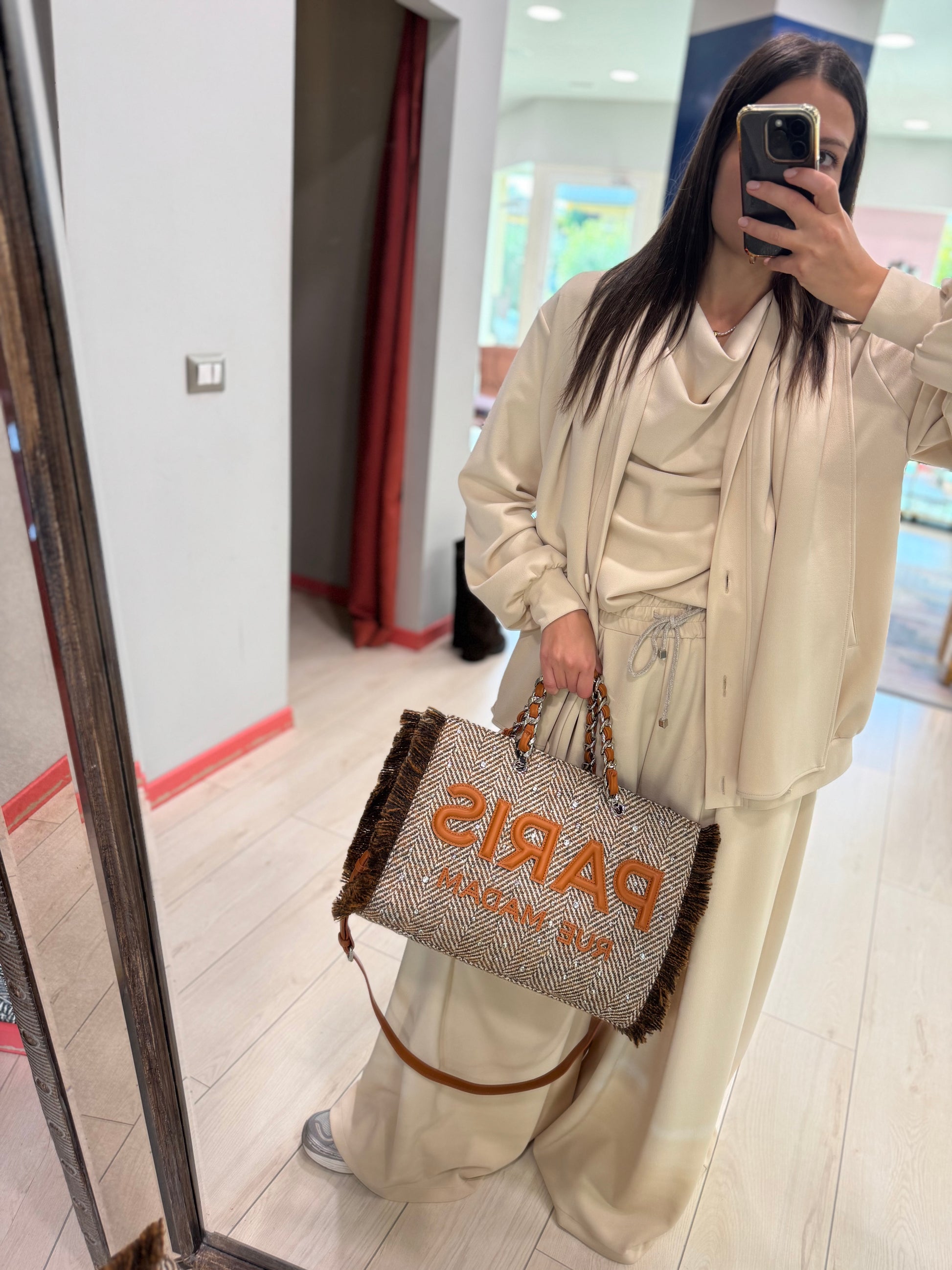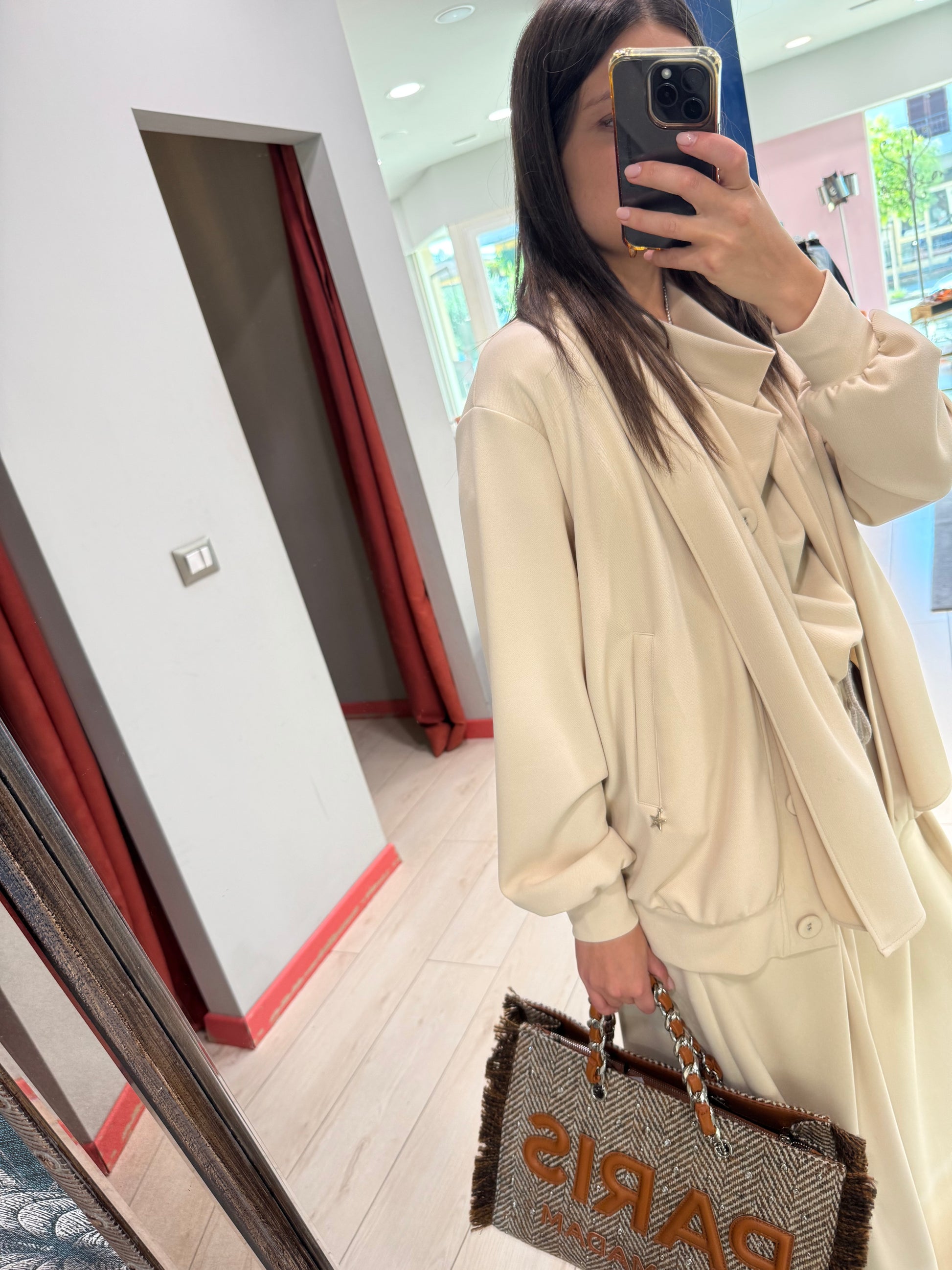 Cardigan BomberSouvenir in crepe con fusciacca – Colori panna e nero Cardigan elegante e versatile firmato Souvenir, realizzato in morbido crepe con dettagli raffinati. Presenta fascia elastica sul fondo e polsini, chiusura con bottoni e pratiche tasche laterali. La fusciacca in vita, removibile, permette di adattare la vestibilità e valorizzare la silhouette. Disponibile nei colori panna e nero, è un capo ideale per look casual chic e outfit sofisticati da giorno e sera.