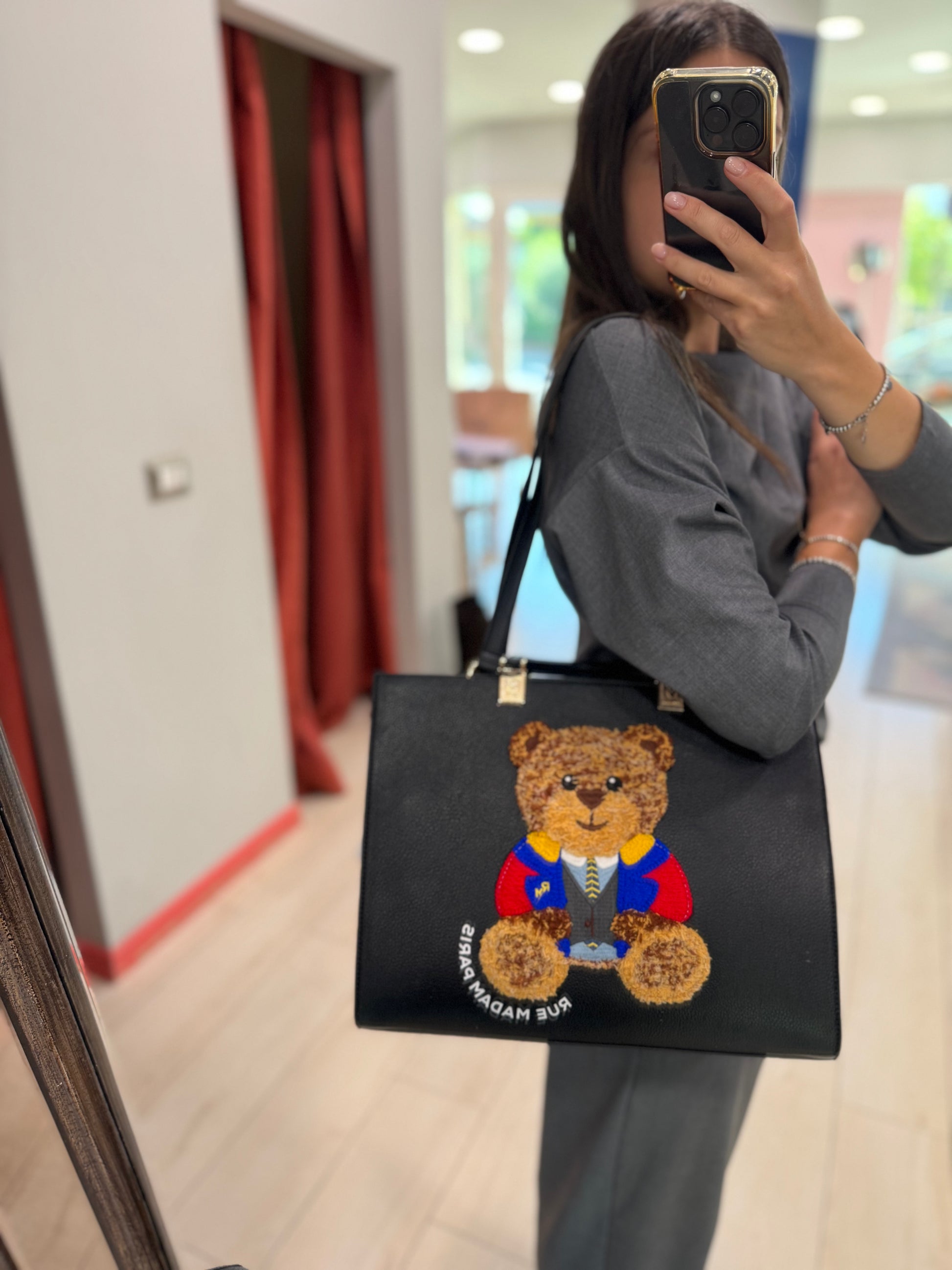 Tote bag in ecopelle martellata con Iconico orsetto Marvin e logo stampato. Manici in ecopelle con dettagli metallici logati e doppia tracolla. Tasca centrale in ecopelle con zip e fodera interna in cotone con tasca. L 36 H 27 P 16