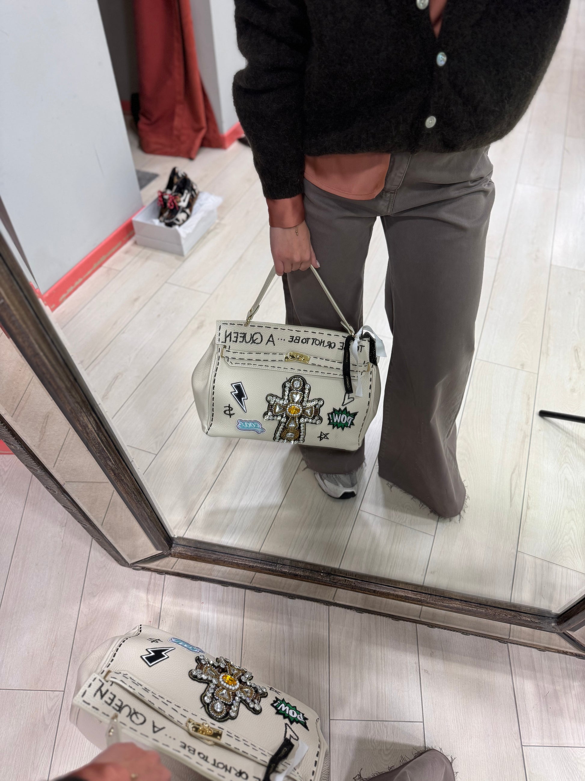 Distinguiti con questa borsa a mano bianca dallo stile audace e contemporaneo. Realizzata in ecopelle di alta qualità, presenta ricami decorativi, patch colorati e dettagli gioiello che donano un tocco glam-rock al tuo look. La chiusura con patta e fibbia dorata aggiunge eleganza, mentre la struttura capiente la rende perfetta per accompagnarti durante tutta la giornata.