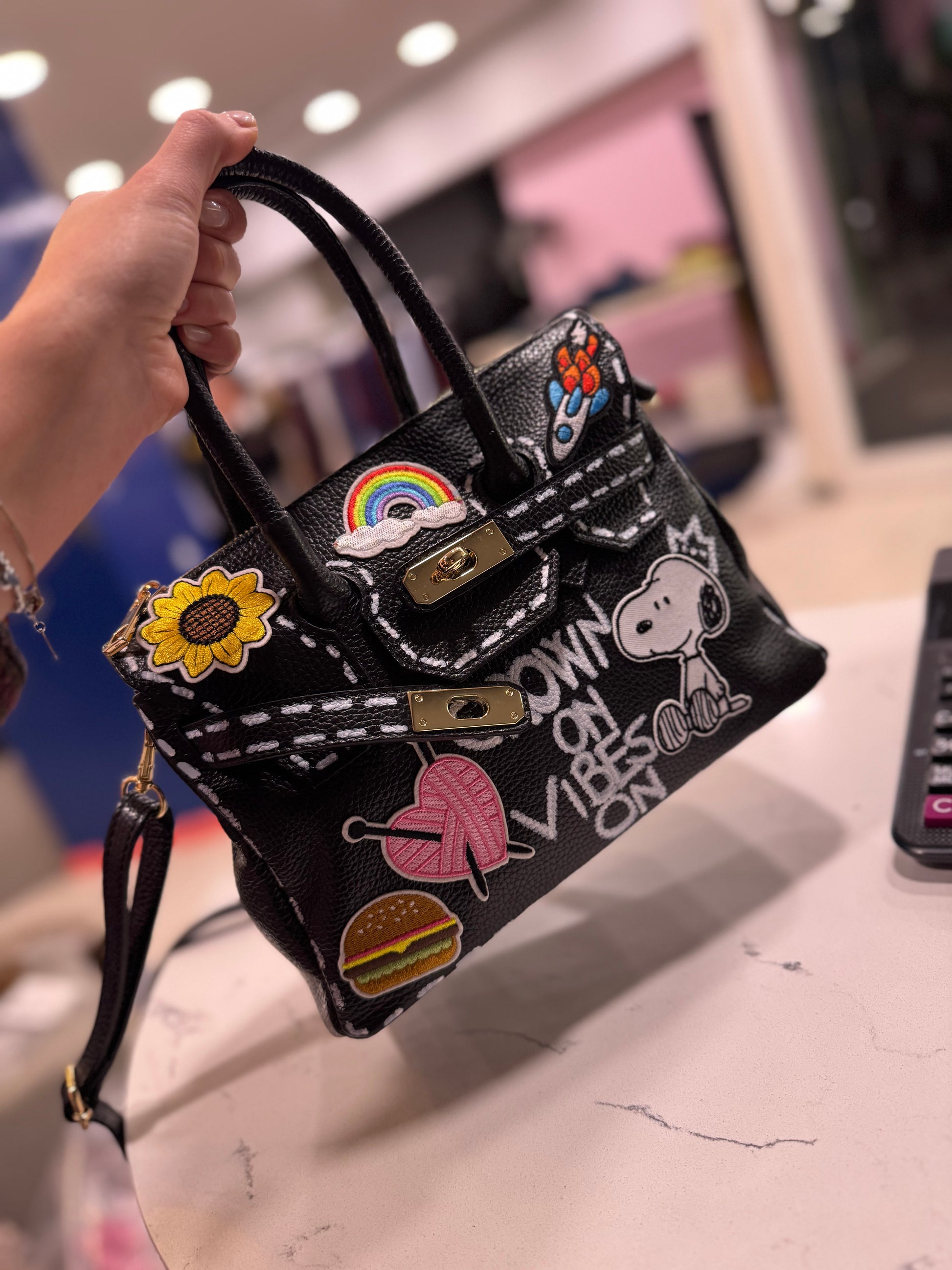 Aggiungi un tocco di originalità al tuo look con questa esclusiva borsa nera decorata con patch colorate. Realizzata in ecopelle di alta qualità, presenta applicazioni ricamate come un arcobaleno, un girasole, un hamburger e simpatici motivi cartoon che esprimono energia e positività. La chiusura metallica dorata e i manici rinforzati garantiscono eleganza e praticità. Perfetta per chi ama distinguersi con un accessorio trendy e dal carattere pop.