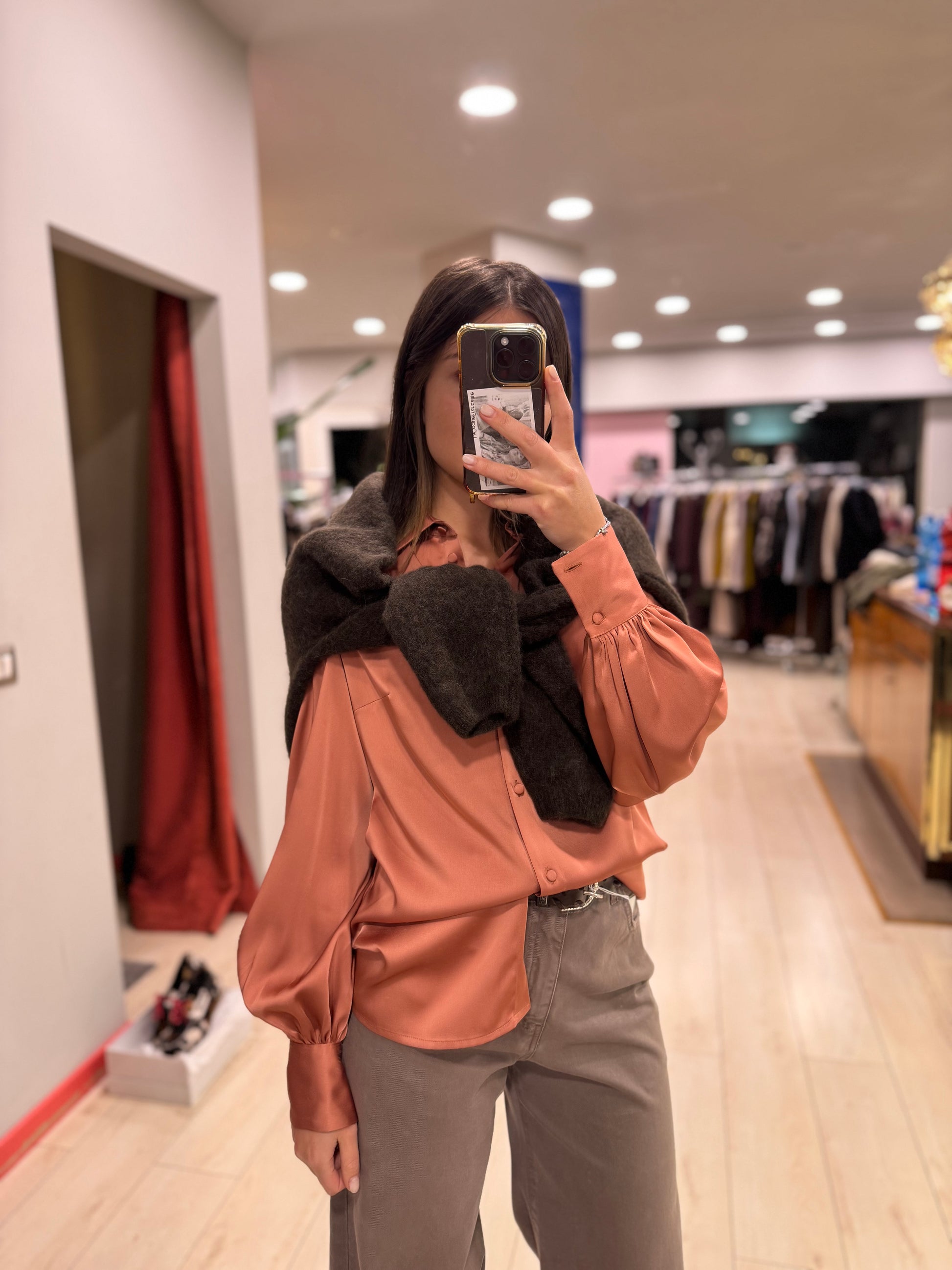 Camicia in raso con bottoni ricoperti, leggero effetto a sbuffo sul polsino.