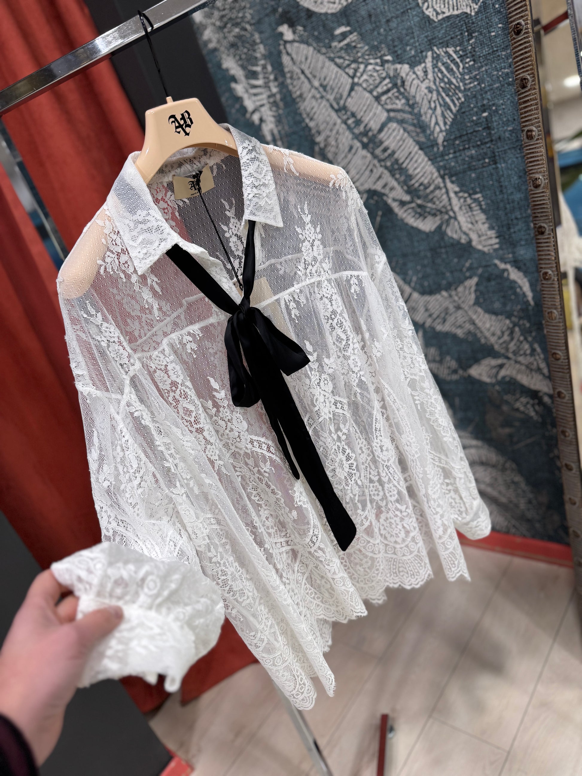 • Camicia Raya in pizzo di misto cotone • Colletto classico con foulard • Maniche lunghe a palloncino • Polsi con bottoni • Chiusura con bottoni