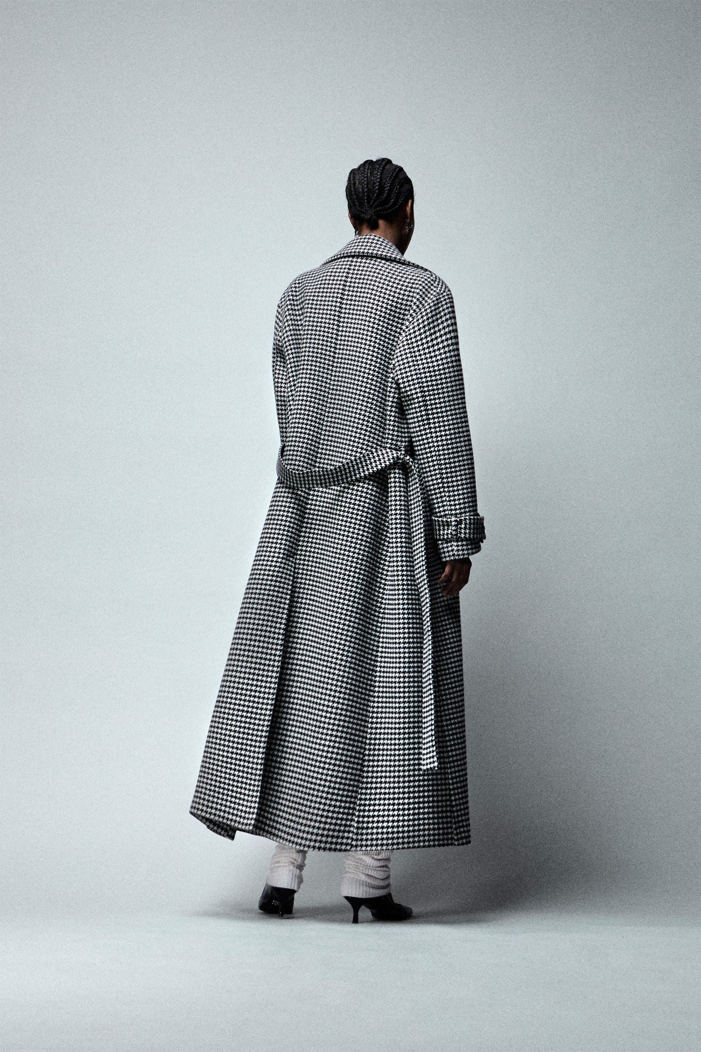 Cappotto lungo stile trench fantasia pied de poule, con cintura in vita. Taglia XS, buona vestibilità