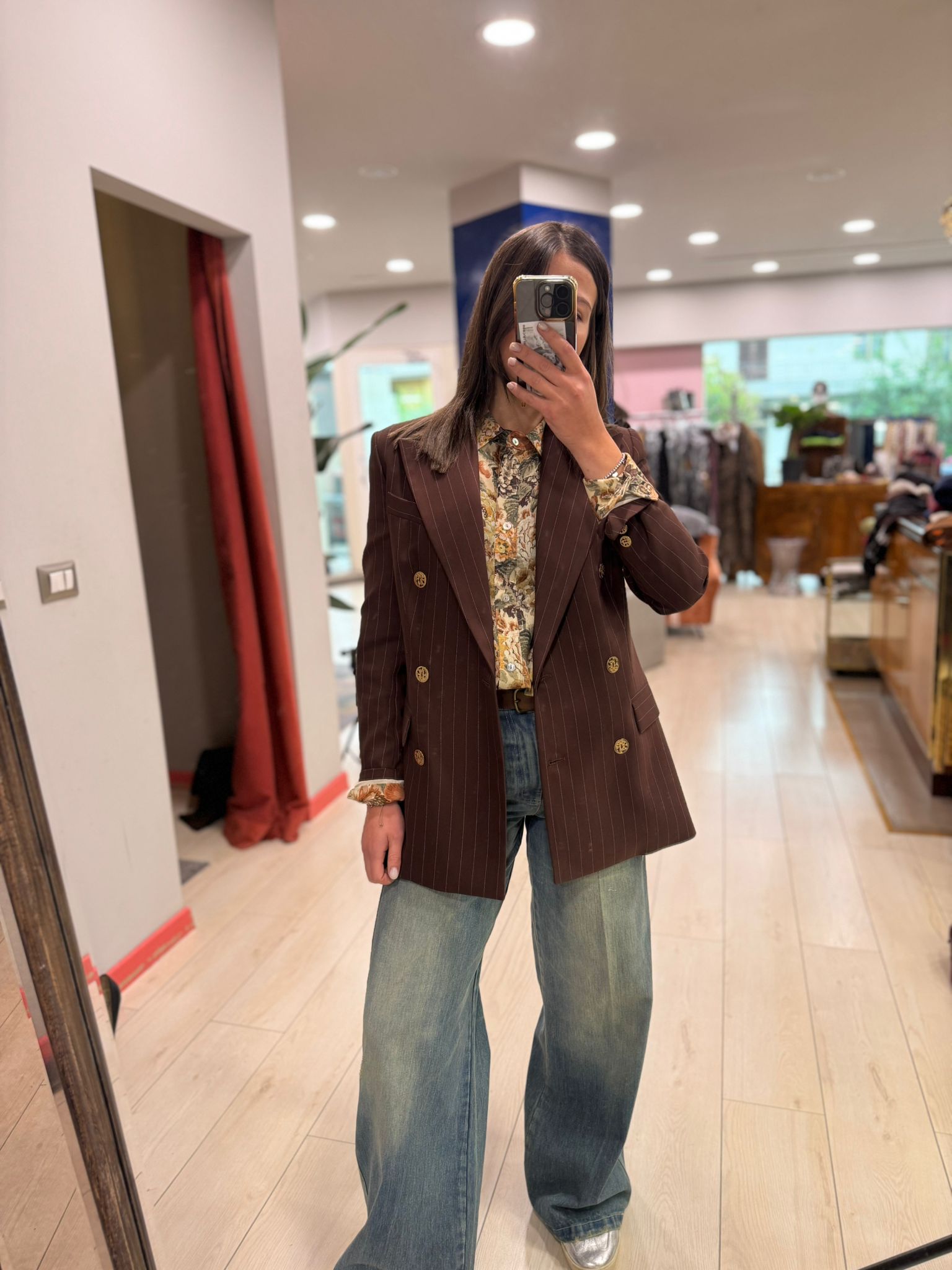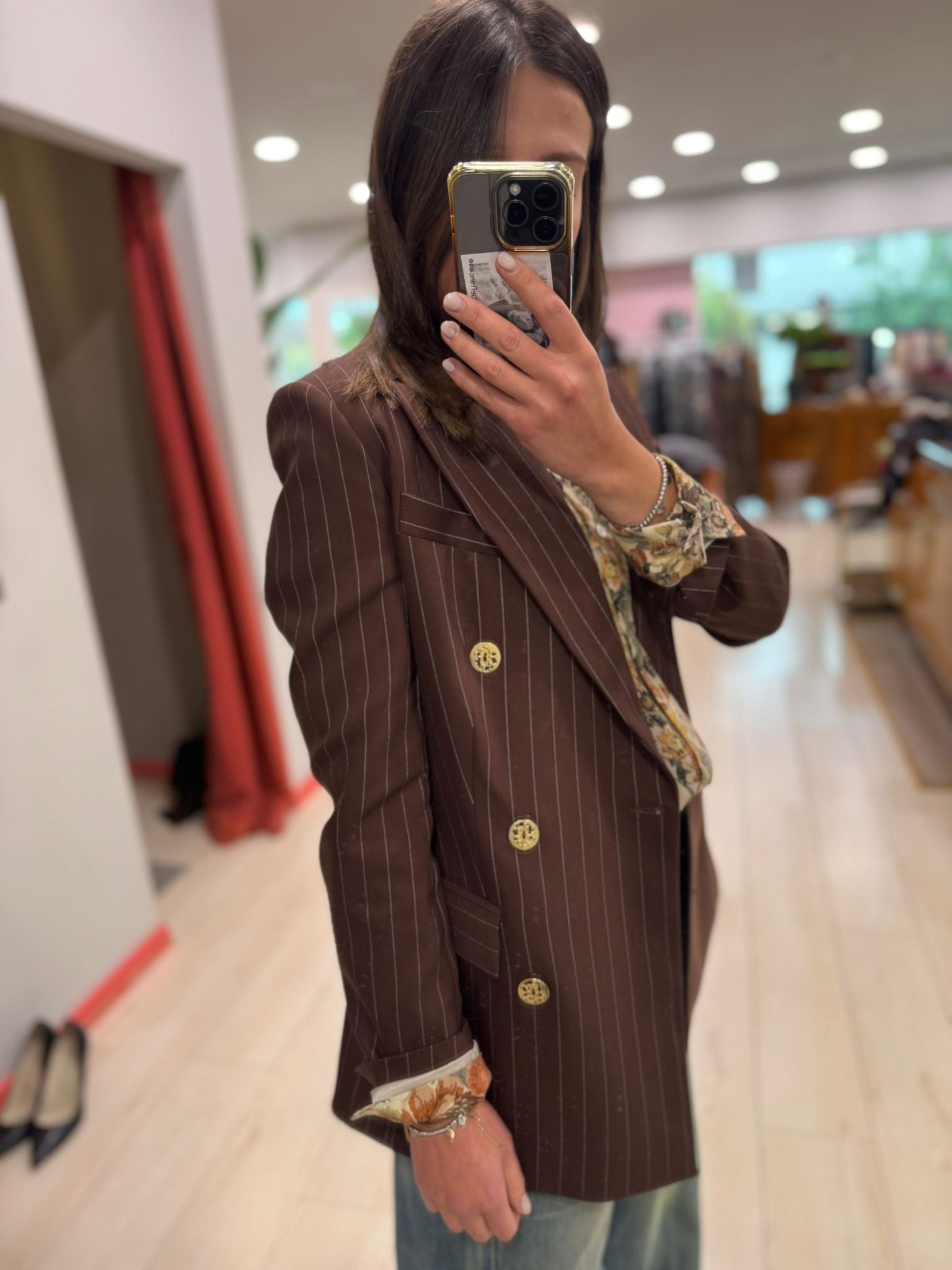 La giacca doppiopetto Silence è un capo iconico, raffinato e intramontabile. Realizzata in tessuto gessato color marrone caldo, valorizzato da bottoni dorati che aggiungono un tocco di luce e femminilità, rappresenta l’equilibrio perfetto tra eleganza e carattere.