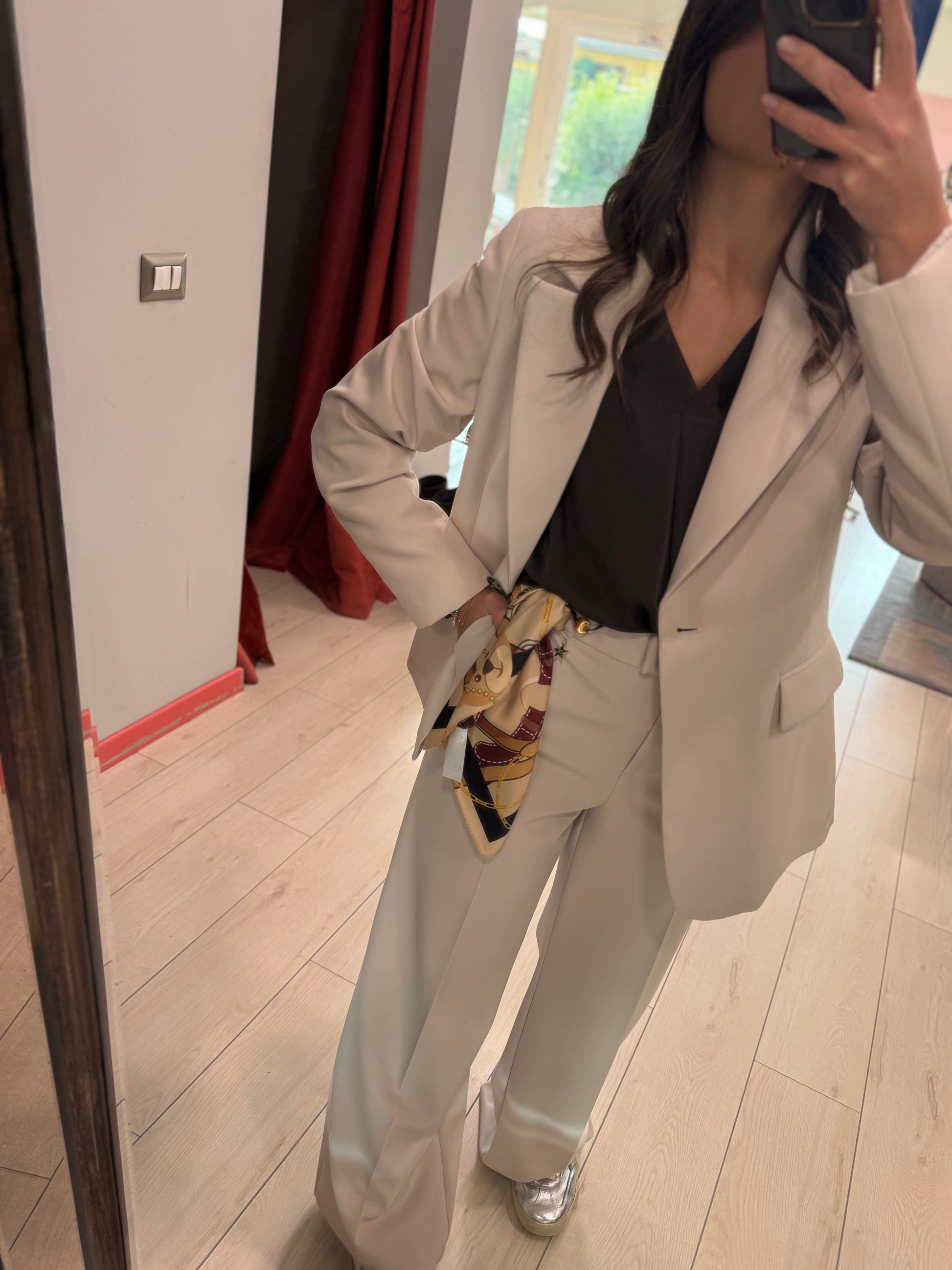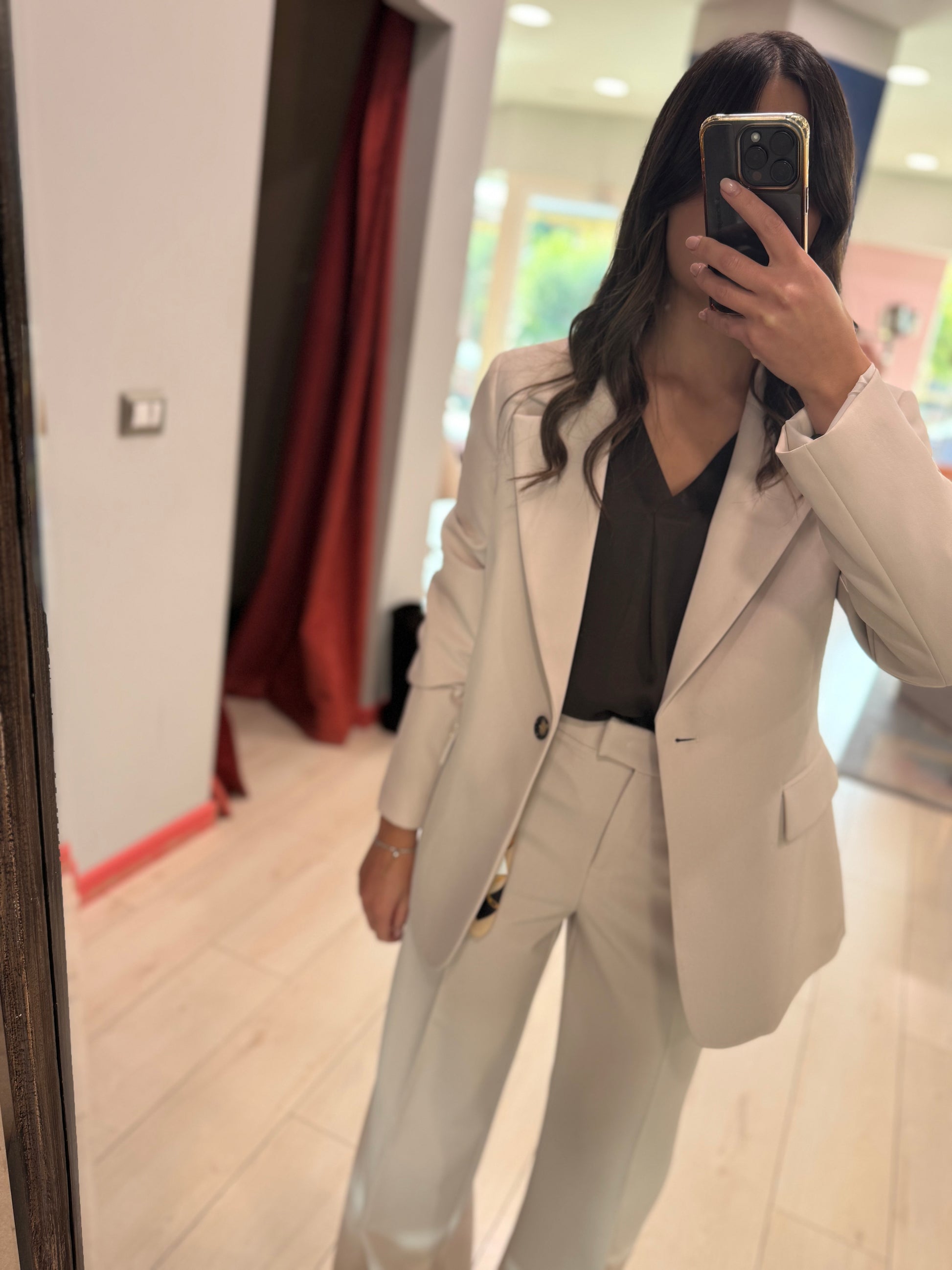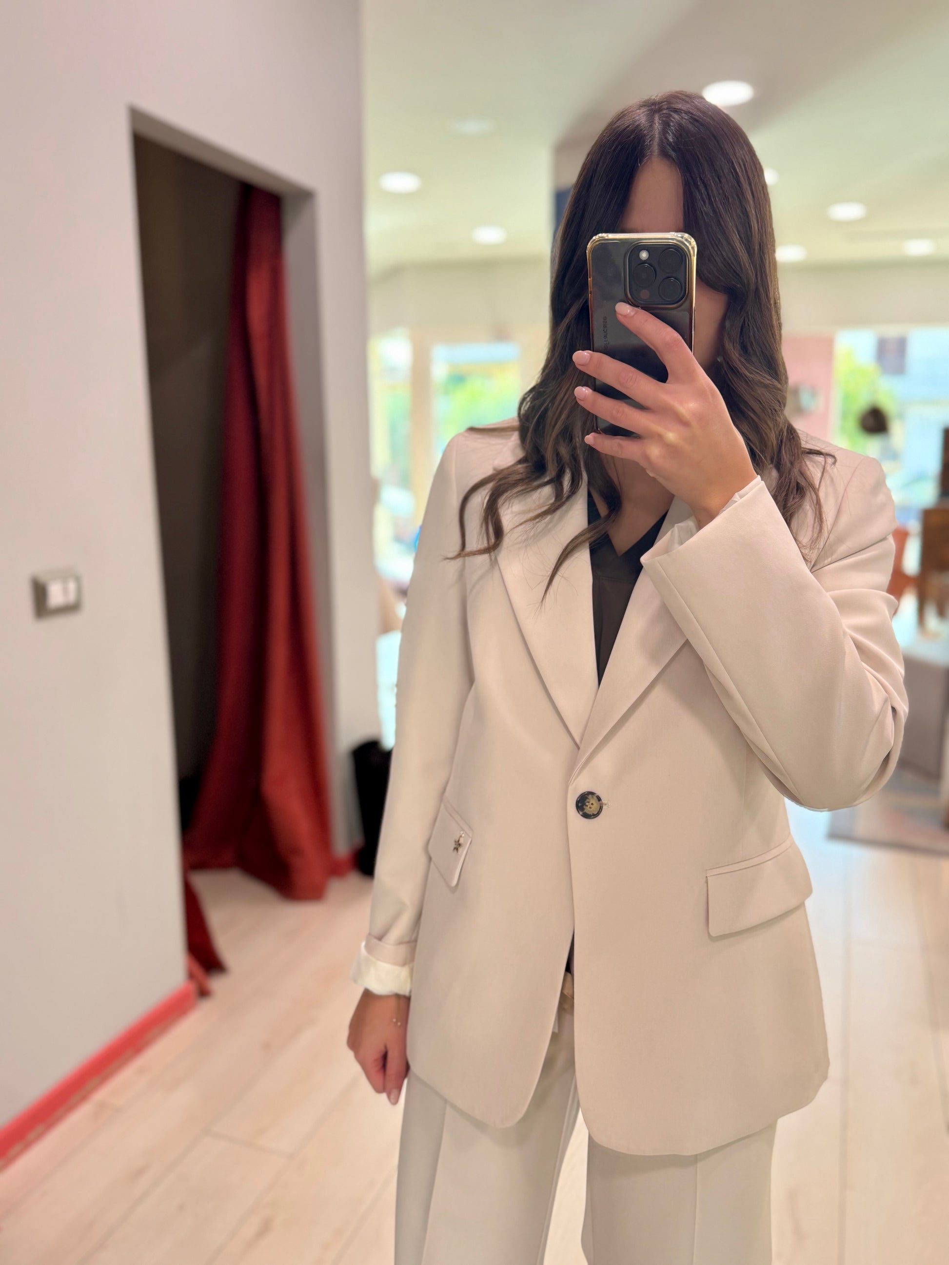 Giacca Souvenir donna in tessuto fluido tecnico, colore intonaco chiaro, dal taglio sartoriale moderno. Con un unico bottone frontale, tasche con pattina e dettagli curati, è il capo ideale per creare look raffinati e versatili. Perfetta come giacca da ufficio elegante o da indossare nelle occasioni speciali, si abbina facilmente a pantaloni coordinati o a jeans per un mix & match contemporaneo. Must-have per uno stile femminile, sofisticato e senza tempo.