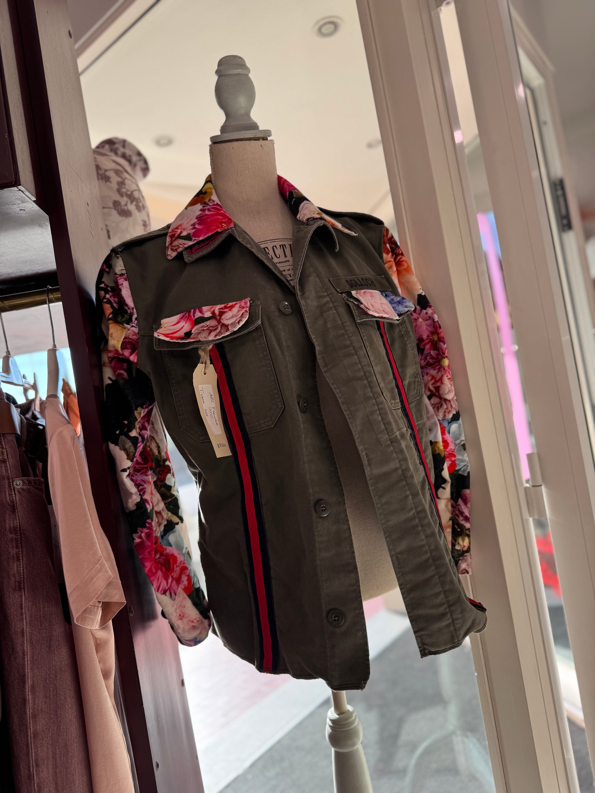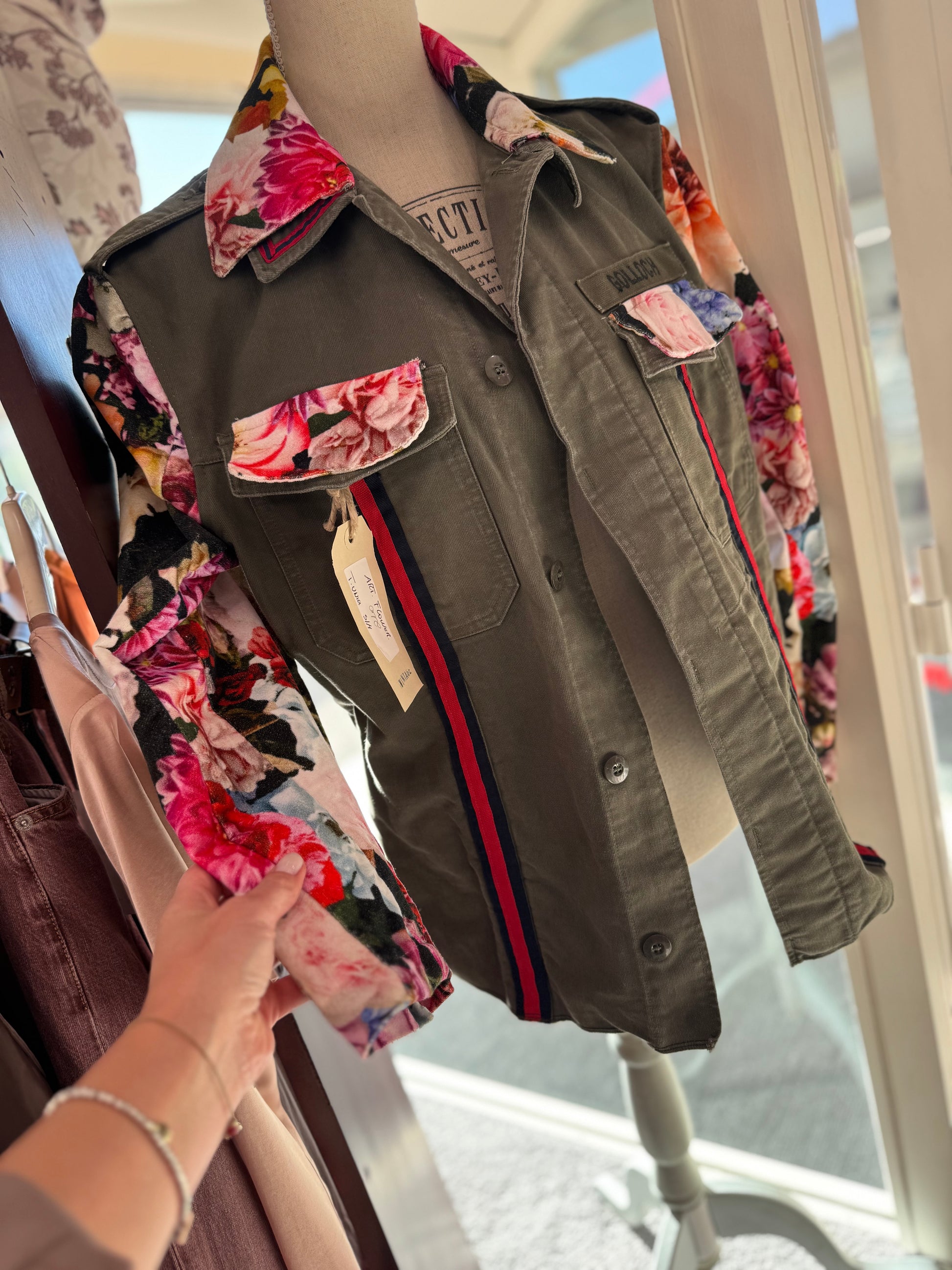 Aggiungi un tocco unico al tuo look con questa giacca stile military chic, caratterizzata da un sorprendente contrasto tra il verde militare e vivaci inserti floreali. Realizzata in morbido cotone, presenta maniche e colletto in tessuto effetto velluto con stampa floreale multicolor, per un look femminile e grintoso allo stesso tempo. Le tasche frontali con patta, i bottoni tono su tono e le bande laterali rosso/blu navy aggiungono un tocco urban raffinato. Ideale da indossare in autunno, si abbina perfettamente a jeans, pantaloni cargo o gonne per un outfit casual ma ricercato.