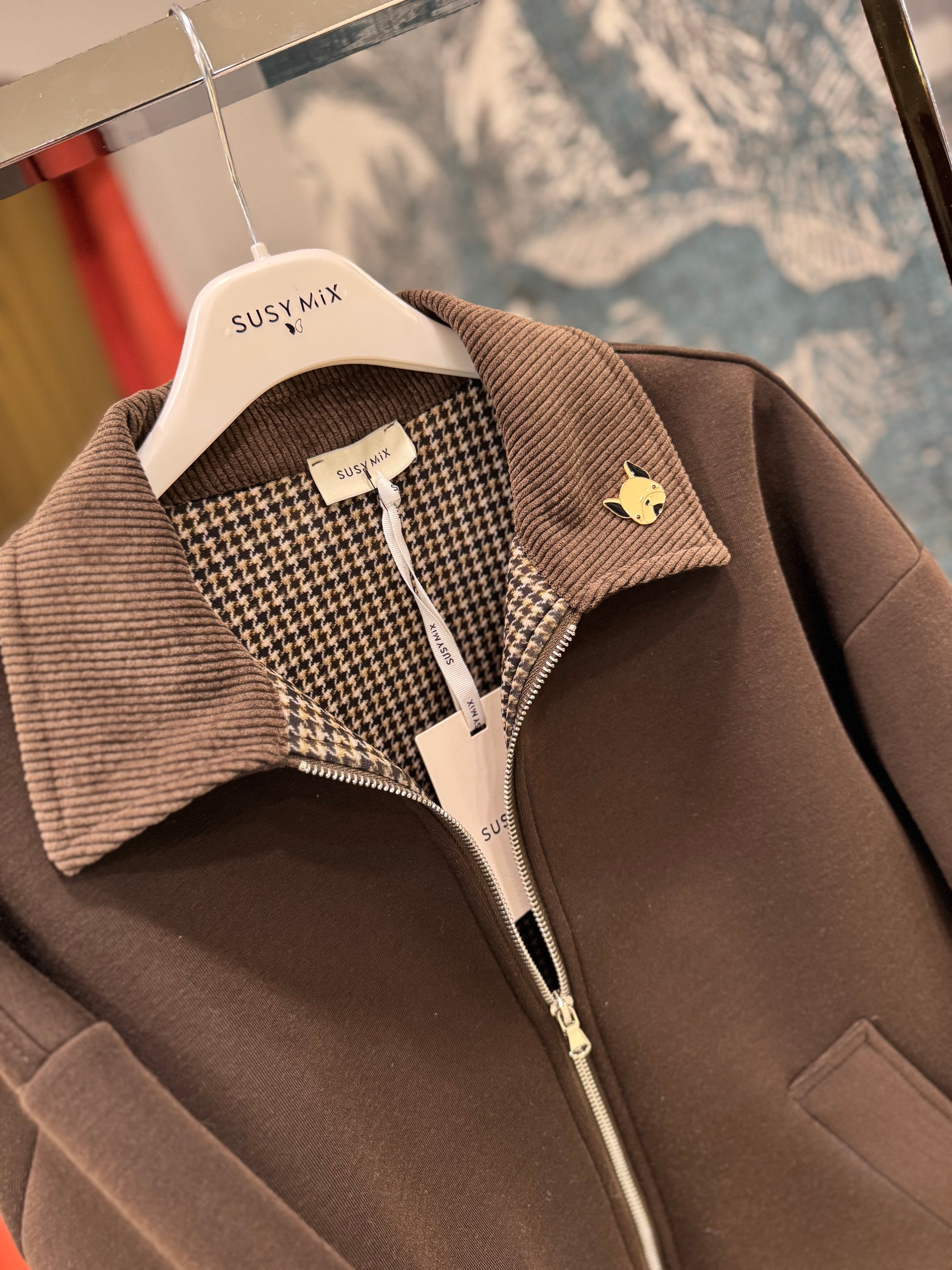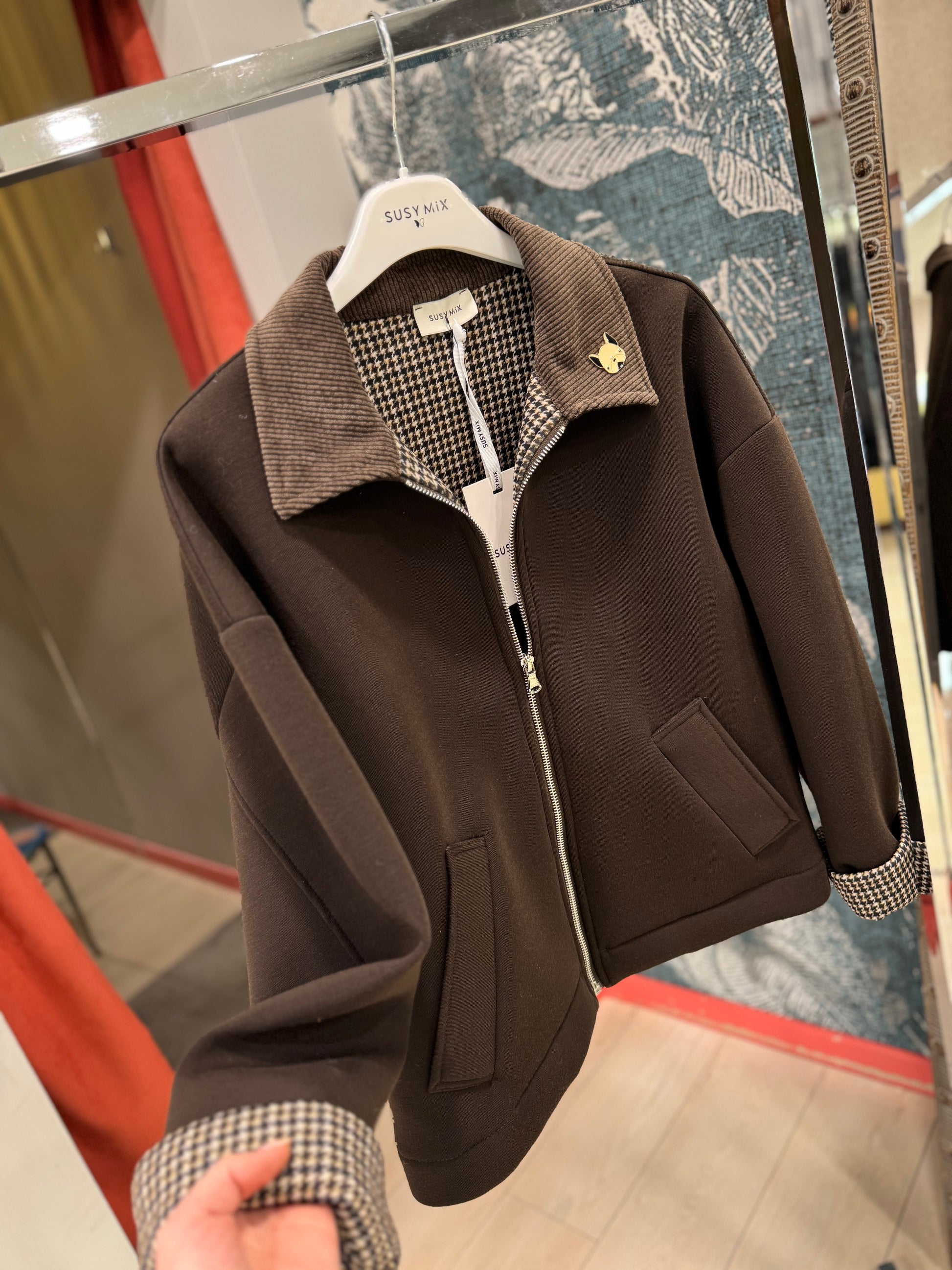 Giubbino corto e boxy in tessuto tecnico morbido (effetto neoprene), chiusura a zip e tasche a filetto. Collo in velluto a coste e dettagli pied de poule a contrasto su interno e risvolti: il tocco sporty-chic perfetto per la mezza stagione. Facile da abbinare con denim, pantalone dritto o gonne midi.