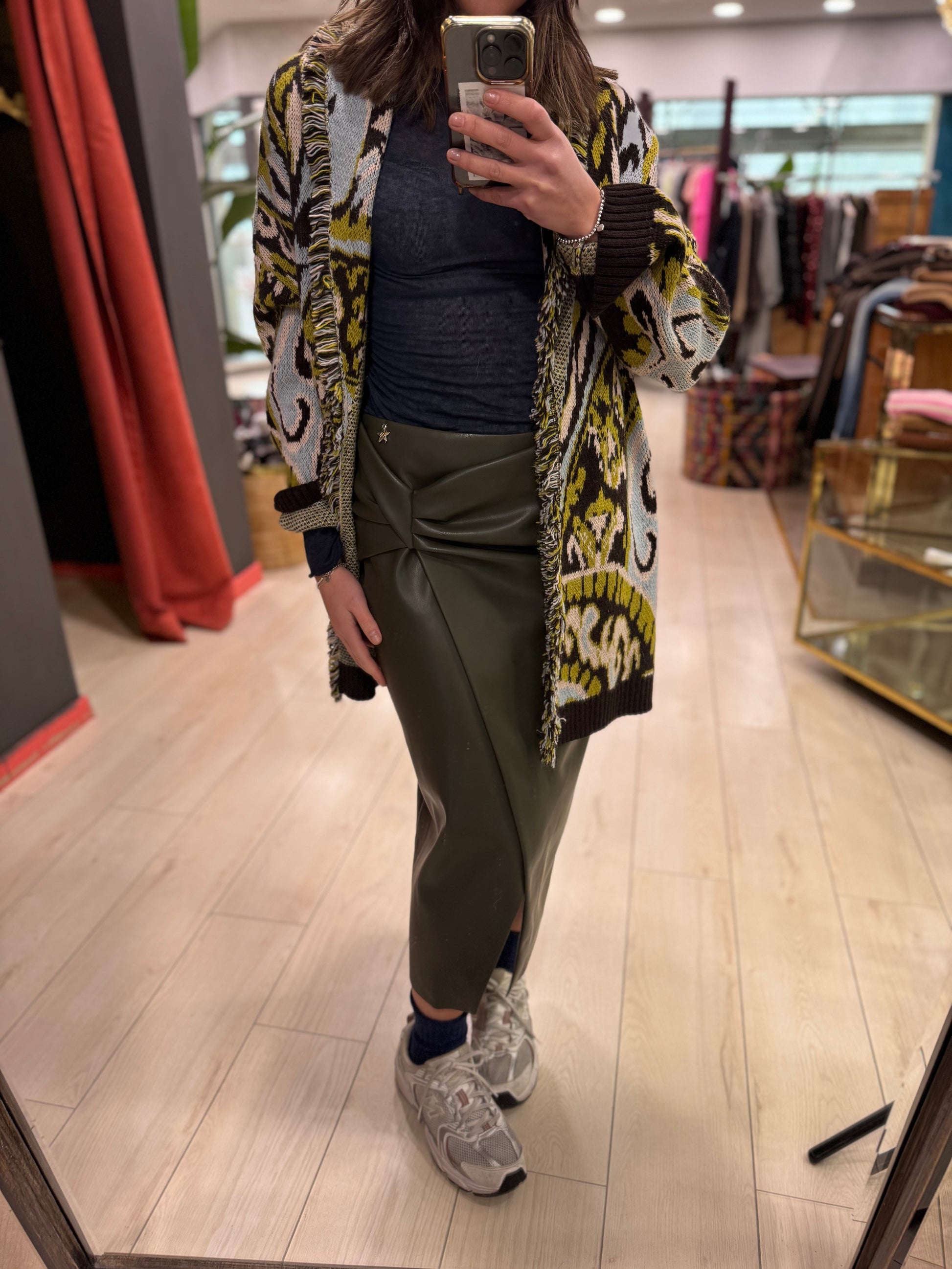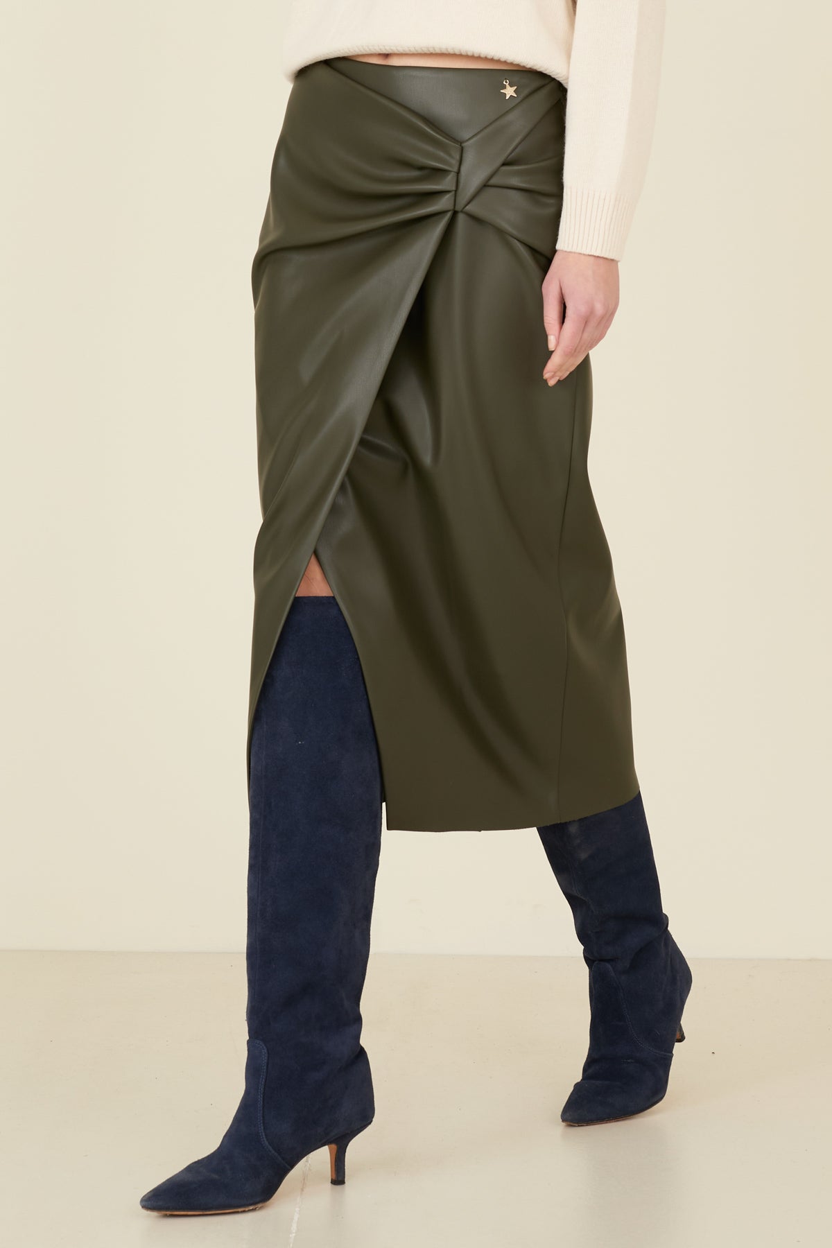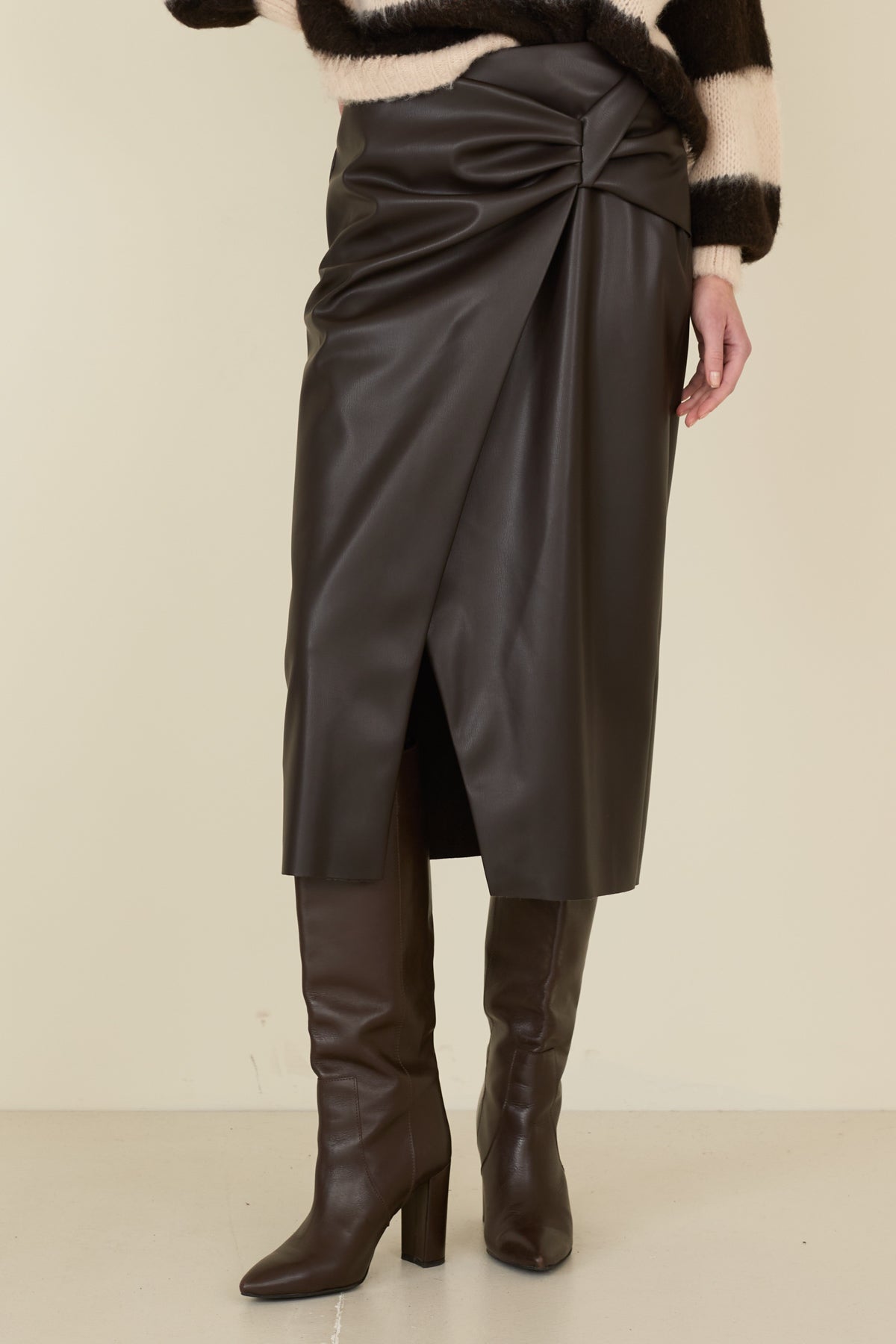 Gonna ecopelle con ripresa. Modello dalla vestibilità regolare, con spacco sul davanti, chiusura con zip.