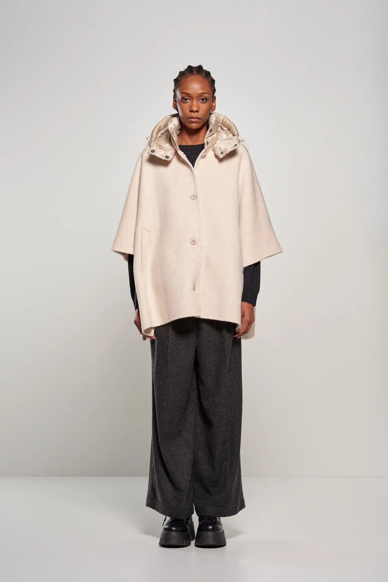Questa mantella corta da donna esprime eleganza e cura ai dettagli in una silhouette oversize, realizzata in lana double face e poliestere, arricchita da un effetto alpaca che dona una texture morbida e sofisticata. La chiusura frontale con bottoni in poliestere abbinata a un ampio collo, si trasforma in un cappuccio staccabile in nylon, imbottito con piuma d’oca (90% piumino, 10% piuma) con fill power 650.