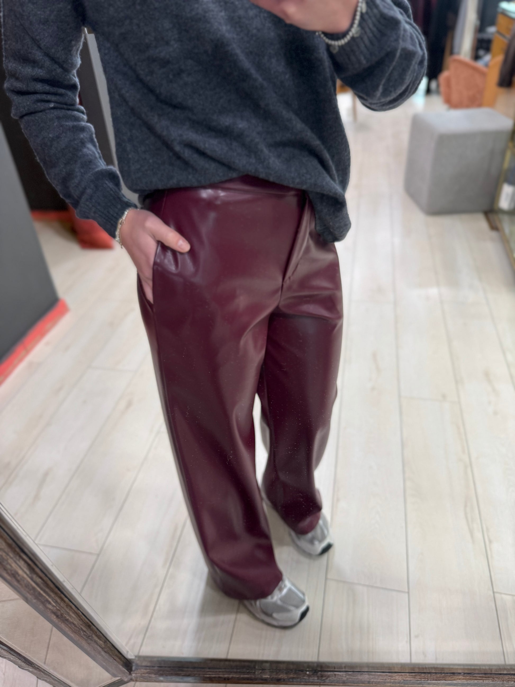 Pantalone ecopelle modello dritto, chiusura con bottone. Disponibile in 2 varianti colore