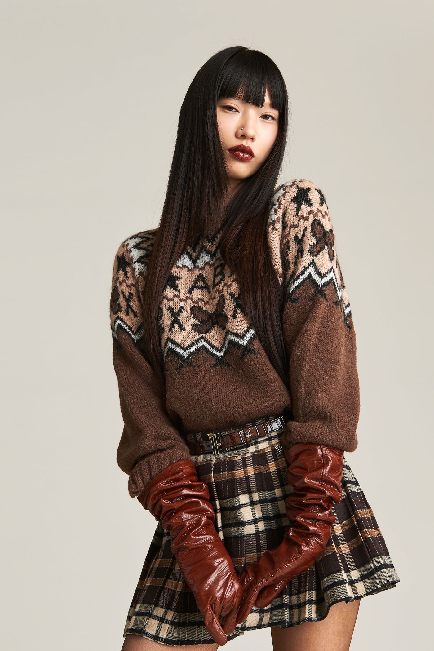 • PULL MIRA IN MISTO ALPACA • FANTASIA ALL OVER NORVEGESE • GIROCOLLO • MANICHE LUNGHE • VESTIBILITÀ RELAXED • CIONDOLO LOGATO SUL RETRO • LA MODELLA È ALTA 175 CM E INDOSSA LA TAGLIA XS