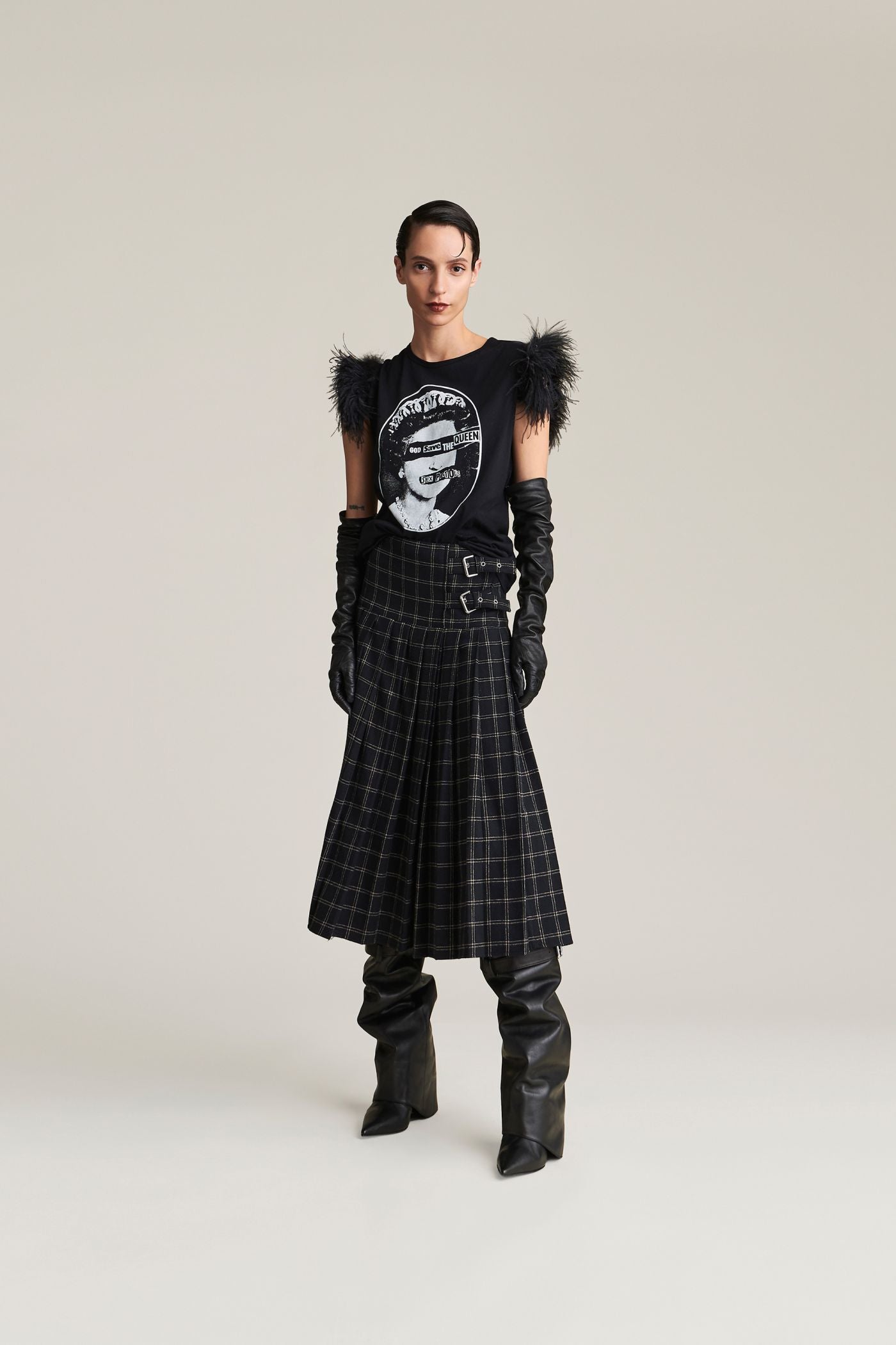 Grinta e leggerezza, energia punk e dettagli soft. Il top Sex Pistols gioca con i contrasti: la stampa frontale dedicata alla band esprime energia ribelle, addolcita dalle piume che incorniciano le maniche. Sul retro, il lettering Aniye By firma il look.