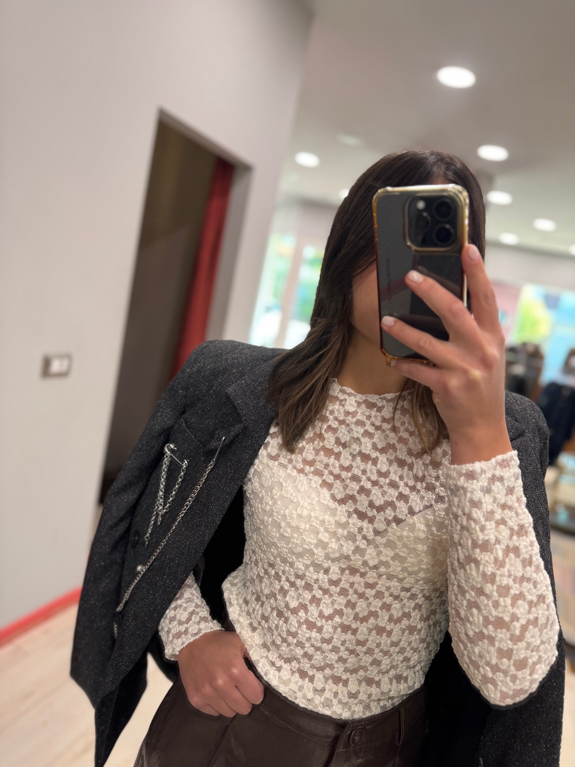 Tshirt in pizzo manica lunga, scollo tondo, in pizzo effetto boucle, variante colore panna