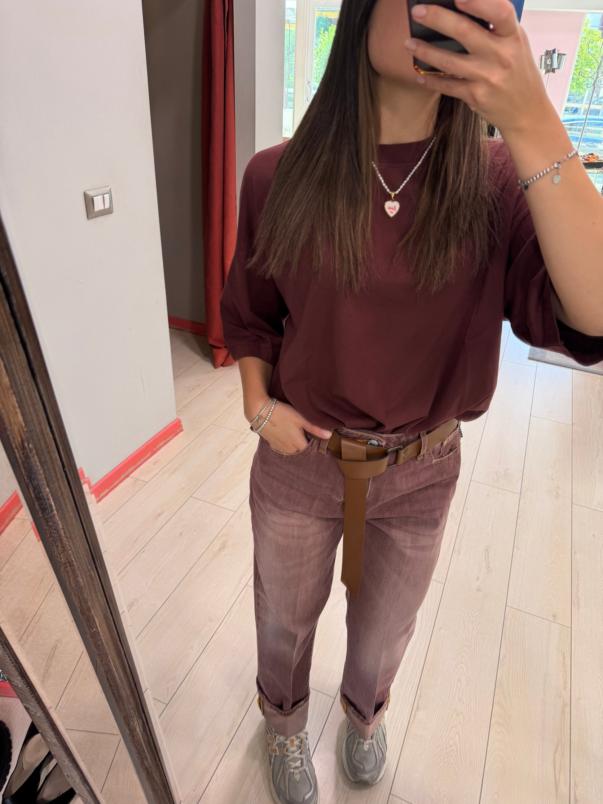 Il colore bordeaux intenso la rende ideale per la stagione, facile da abbinare a jeans, pantaloni cargo o gonne per look casual chic. Una t-shirt minimal ma d’effetto, che diventa il pezzo chiave di outfit quotidiani o più ricercati.