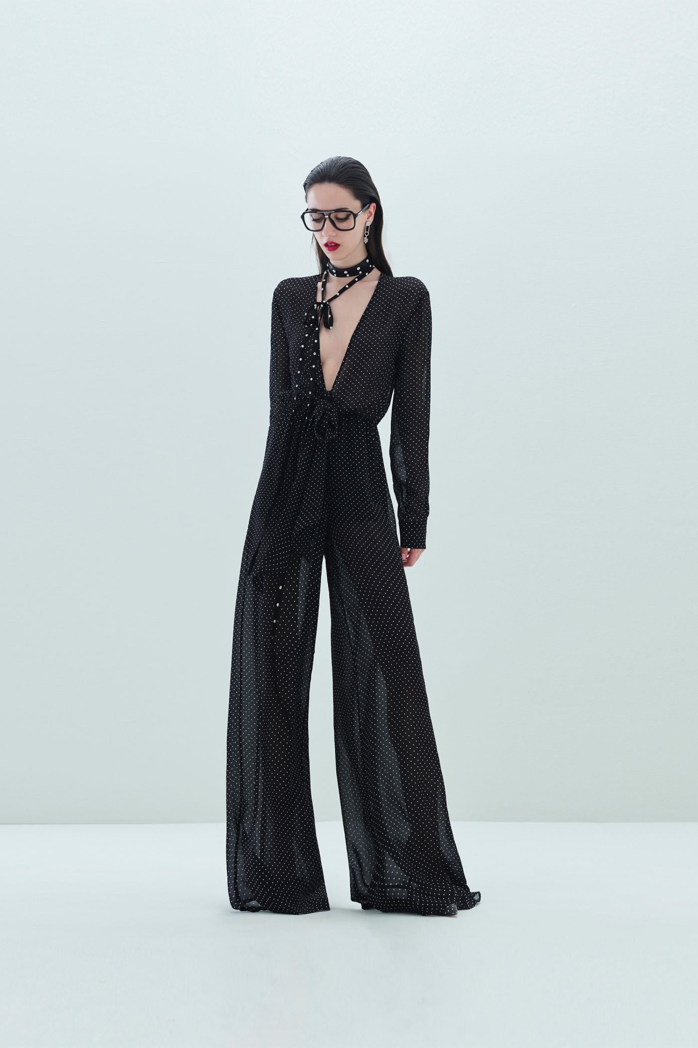 La tuta Lily con stampa a pois unisce fascino sofisticato e dettagli sensuali. Il modello ha linea fluida con pantaloni ampi e si caratterizza per lo scollo a V profondo sul davanti e la maxi goccia sul retro. Il fiocco si annoda in vita e valorizza la silhouette.