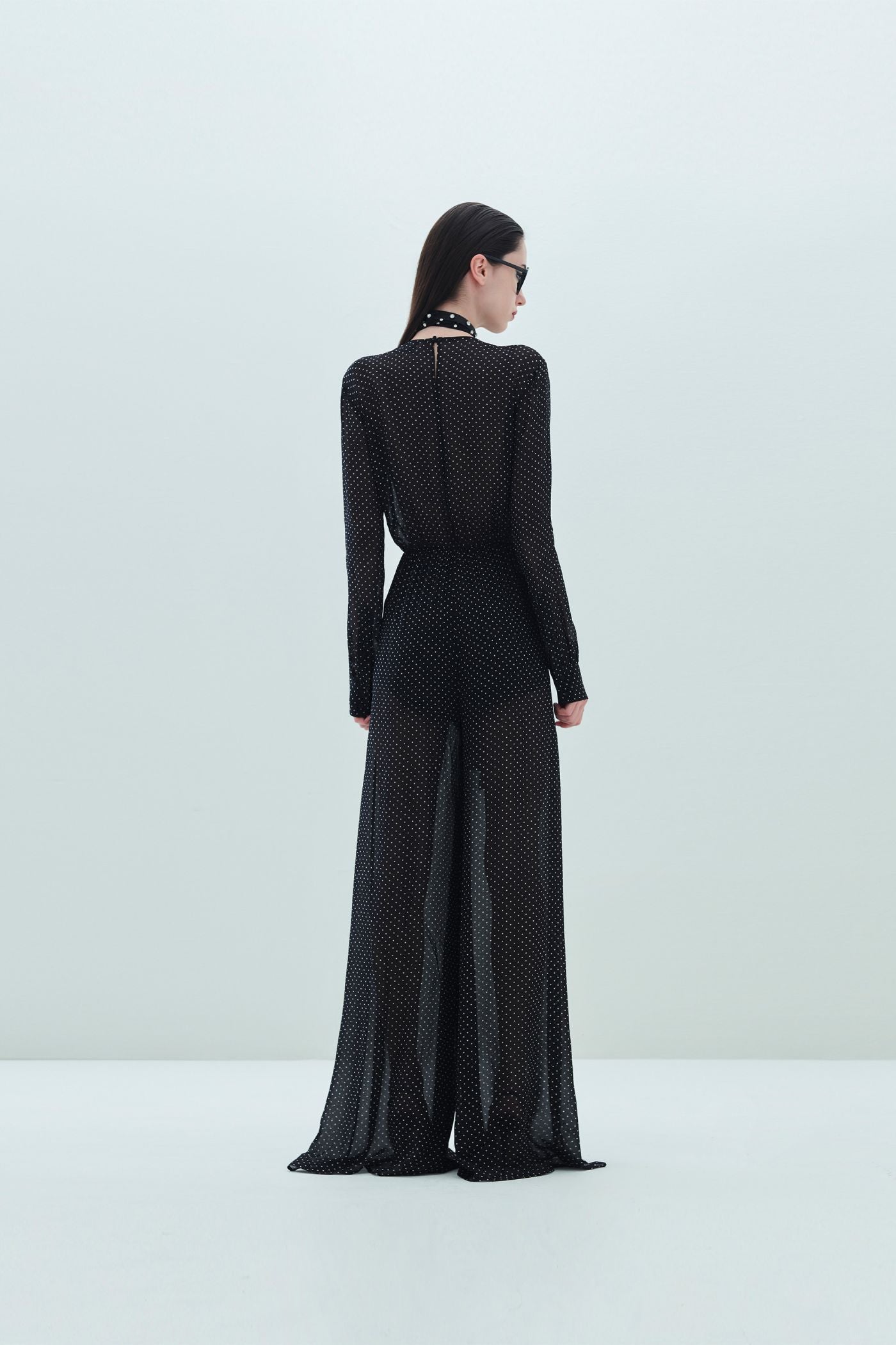 • Tuta Lily in viscosa • Stampa a pois • Scollo a V con bottone sul retro • Maniche lunghe • Elastico in vita • Fiocco al punto vita • Fodera interna